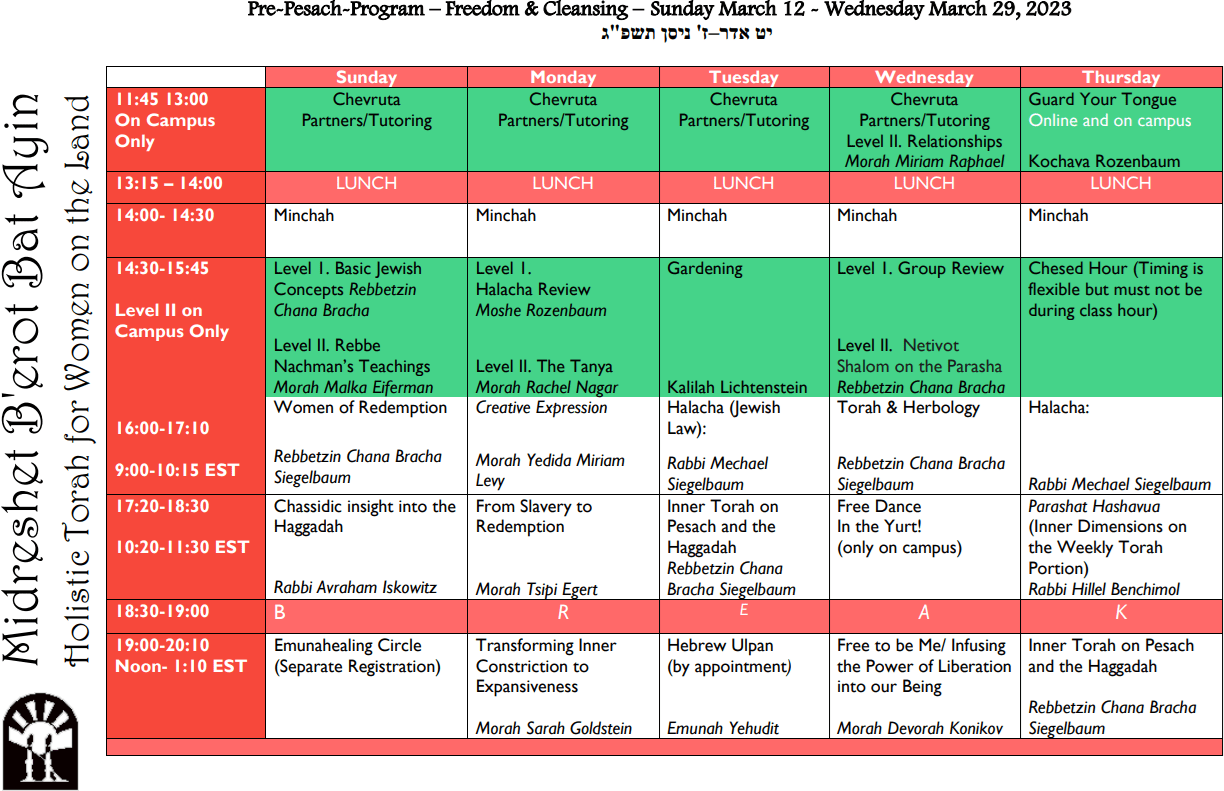 🌸 Stretch your mind, body & soul through Torah learning, Prayer, Healing Movement, Song and Nutritious Meals! 🌸 Learn Spiritual Insights about Pesach! 🌸 Dive into the depths of the Haggadah! 🌸 Design your own Miriam’s Drum and experience personal redemption from Mitzrayim! 🌸 Discover the freedom in the natural beauty of the Judean foothills, hike in the tranquil hills and breath fresh air! 🌸 Connect to Eretz Israel the way only a gardener can! 🌸 Make new friends and be part of our supportive community of like-minded women! |